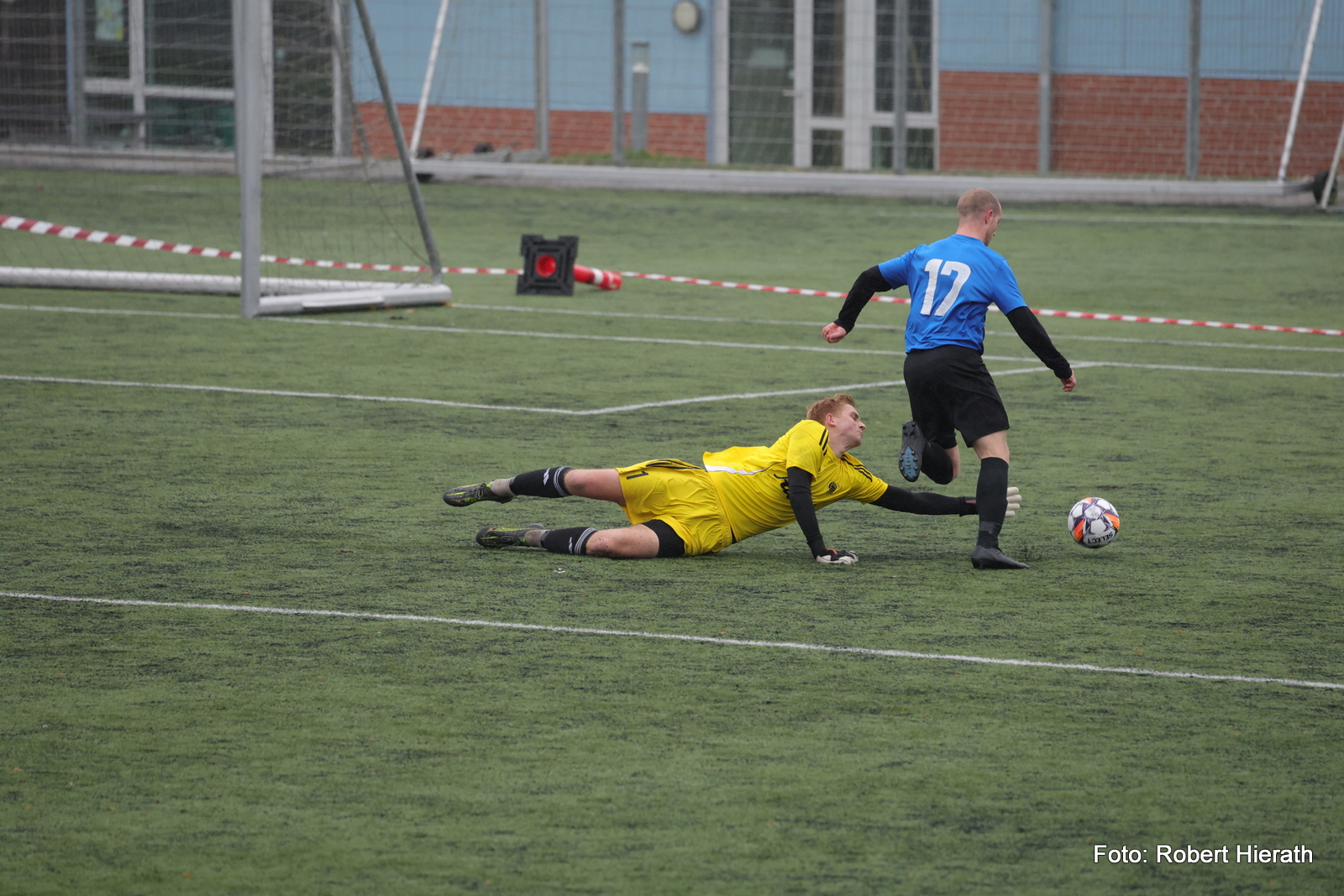 Dalum IFs målmand Gustav Mikkelsen strækker sig så meget som muligt, men FK Utopias Mathias Haahr afdribler flot Dalum målmanden. Derefter sparker han gæsterne i front med 2-1 lørdag eftermiddag. (Foto: Robeert Hierath)