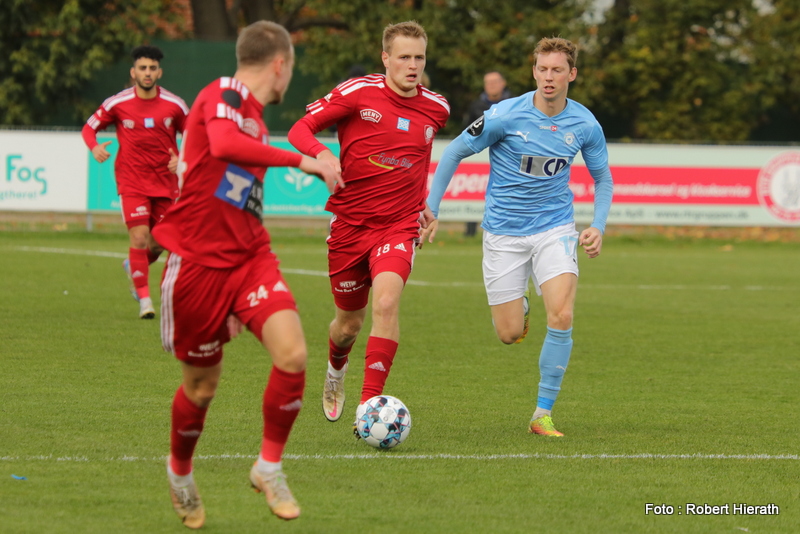Lasse S. Clausen på bolden i opgøret mod FC Roskilde. Derudover ses Kristian Weber i overlappet og Diyar Hamza Ali i baggrunden (Arkivfoto: Robert Hierath)